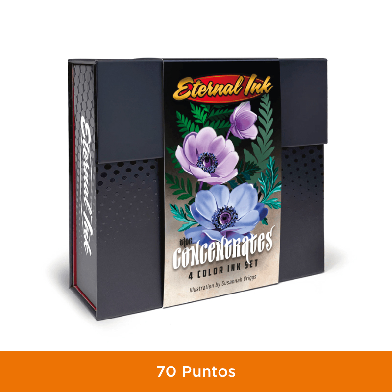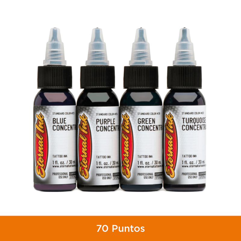 Este set de cuatro colores incluye tres favoritos de Eternal Ink desde hace mucho tiempo: concentrado azul, concentrado morado y concentrado verde, además del NUEVO concentrado turquesa. Estos Concentrados se mezclan perfectamente con cualquiera de nuestros colores Eternal Ink. Agregue este conjunto para intensificar su paleta y realizar transiciones suaves de colores saturados. Mézclalo con tus tonos oscuros para obtener tonos extra ricos y combínalo con otros tonos para aumentar la profundidad y el impacto.