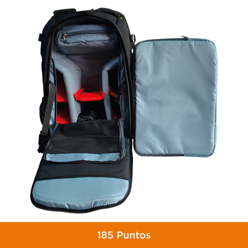 Capacidad DSLR (sin agarre) hasta Nikon D90 o Canon 5D con lente de zoom estándar adjunta; 1-6 lentes adicionales o flashes y accesorios (incluyendo una cámara de apuntar y disparar); trípode compacto o monopod; objetos personales.